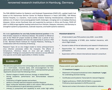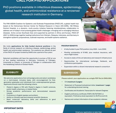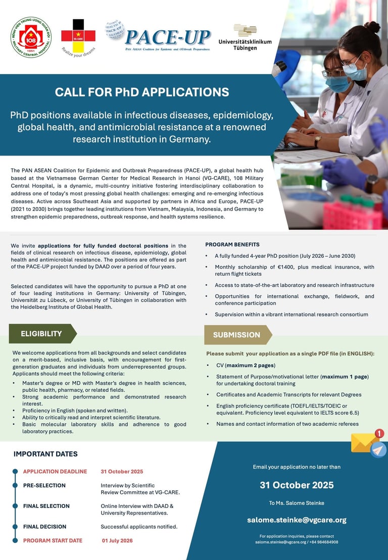 The Vietnamese-German Center for Medical Research (VG-CARE) is a leading international research hub dedicated to advancing clinical and applied research on infectious diseases. Established in 2015 through a collaboration between Tran Hung Dao Hospital (108 Military Central Hospital), Hanoi, and the Institute of Tropical Medicine, Travel Medicine and Human Parasitology, University of Tübingen, Germany, VG-CARE is committed to strengthening healthcare capabilities through cutting-edge research, education, and community engagement. As a globally recognized center for pandemic preparedness and outbreak response, VG-CARE partners with international institutions to conduct GCP/GLP-compliant clinical trials, driving innovation and health equity for all populations.