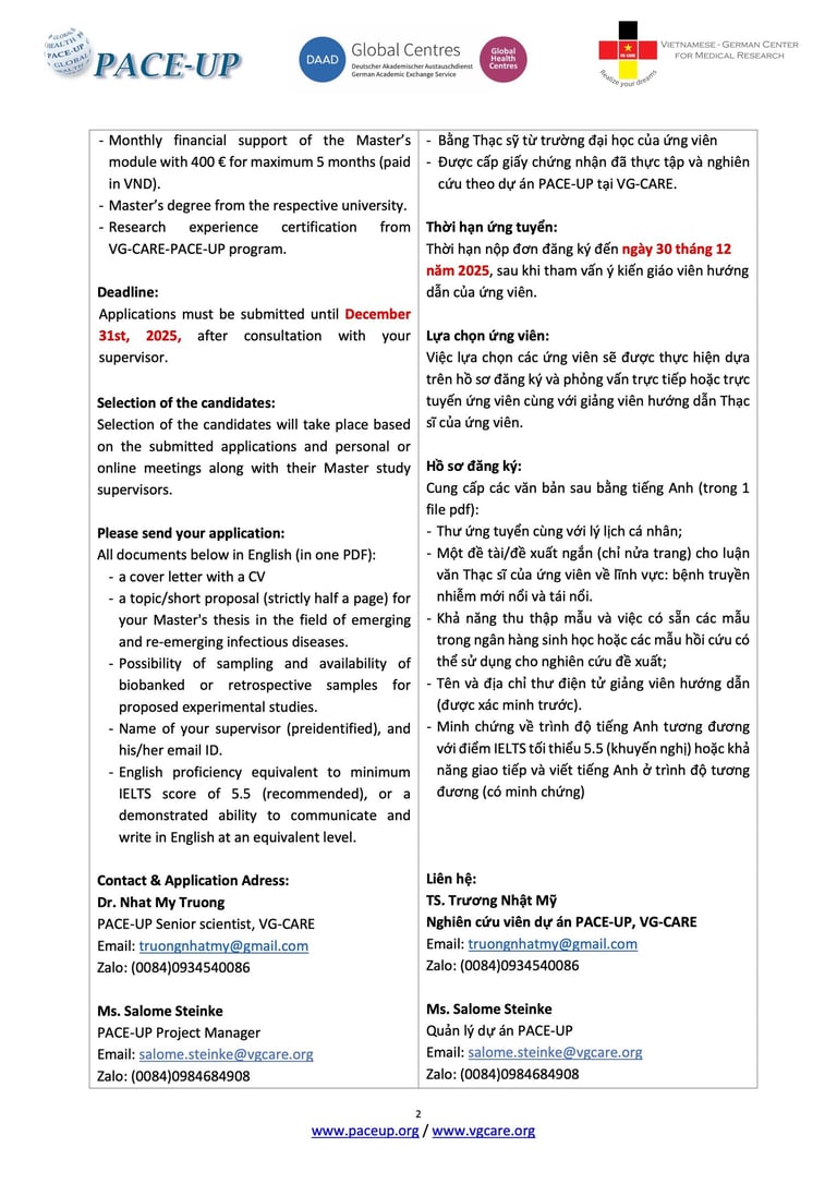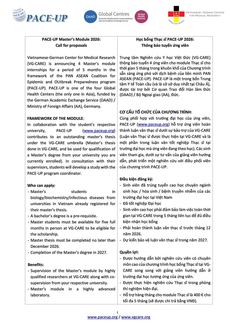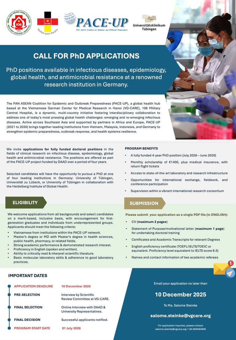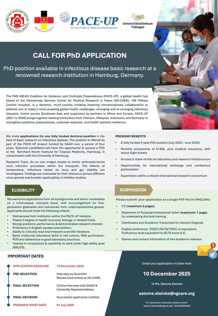 The Vietnamese-German Center for Medical Research (VG-CARE) is a leading international research hub dedicated to advancing clinical and applied research on infectious diseases. Established in 2015 through a collaboration between Tran Hung Dao Hospital (108 Military Central Hospital), Hanoi, and the Institute of Tropical Medicine, Travel Medicine and Human Parasitology, University of Tübingen, Germany, VG-CARE is committed to strengthening healthcare capabilities through cutting-edge research, education, and community engagement. As a globally recognized center for pandemic preparedness and outbreak response, VG-CARE partners with international institutions to conduct GCP/GLP-compliant clinical trials, driving innovation and health equity for all populations.