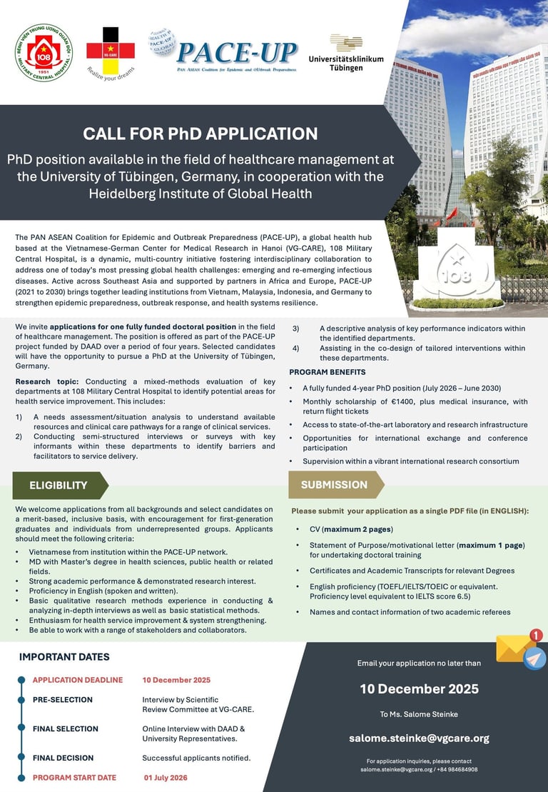 VG-CARE is a collaborative research center established in 2015 through a partnership between Tran Hung Dao Hospital (108 Military Central Hospital), Hanoi, and the Institute of Tropical Medicine, University of Tübingen, dedicated to advancing clinical research on infectious diseases.