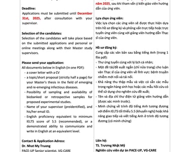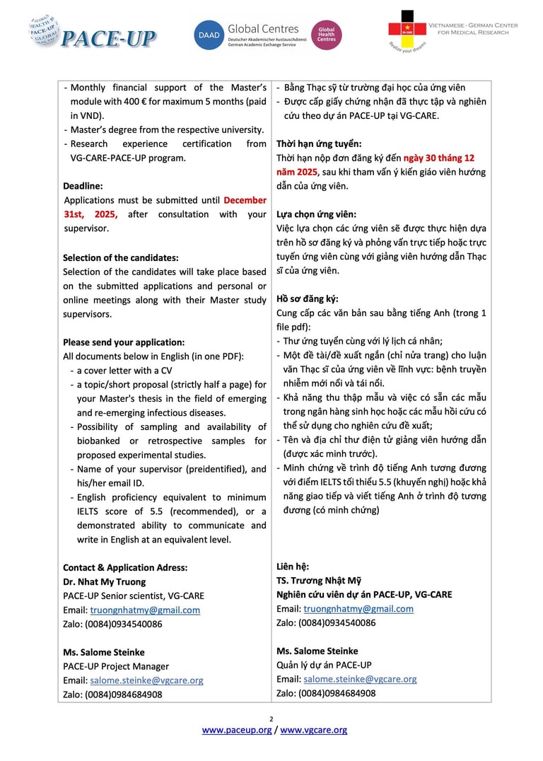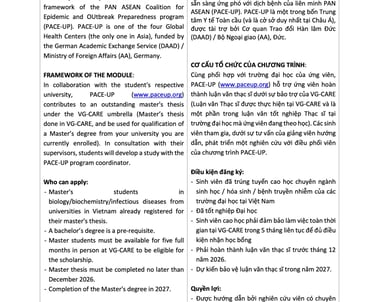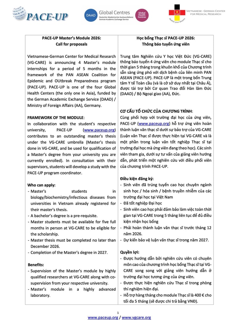 Vietnamese-German Center for Medical Research (VG-CARE) is announcing 4 Master’s module internships for a period of 5 months in the framework of the PAN ASEAN Coalition for Epidemic and OUtbreak Preparedness program (PACE-UP). PACE-UP is one of the four Global Health Centers (the only one in Asia), funded by the German Academic Exchange Service (DAAD) / Ministry of Foreign Affairs (AA), Germany.