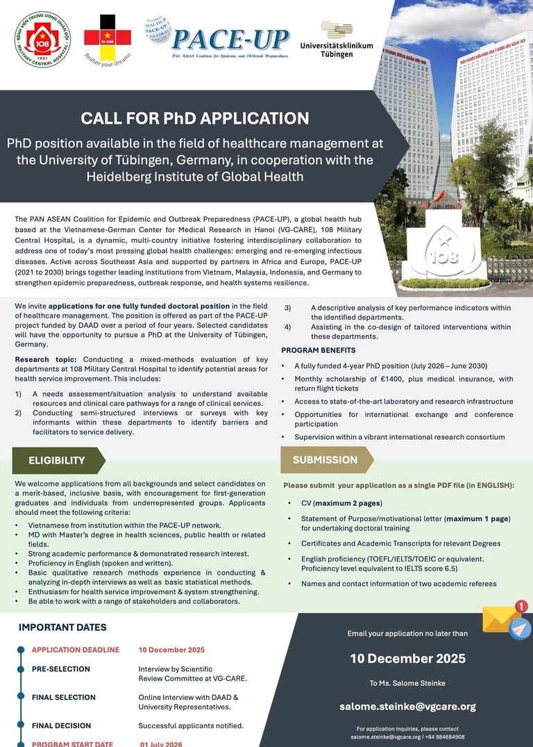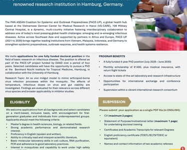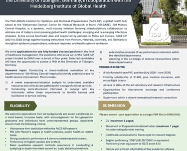 Fully funded PhD positions are now available in infectious diseases, epidemiology, global health, and antimicrobial resistance at leading institutions in Germany. The program is part of the PAN ASEAN Coalition for Epidemic and Outbreak Preparedness (PACE-UP), funded by DAAD.